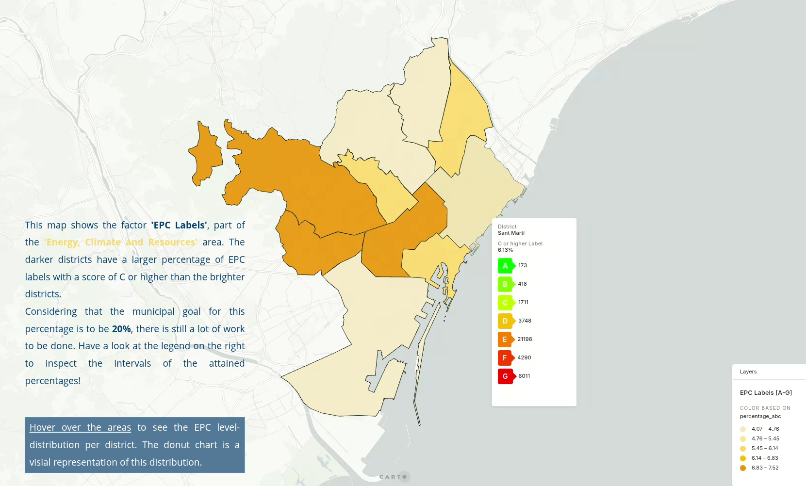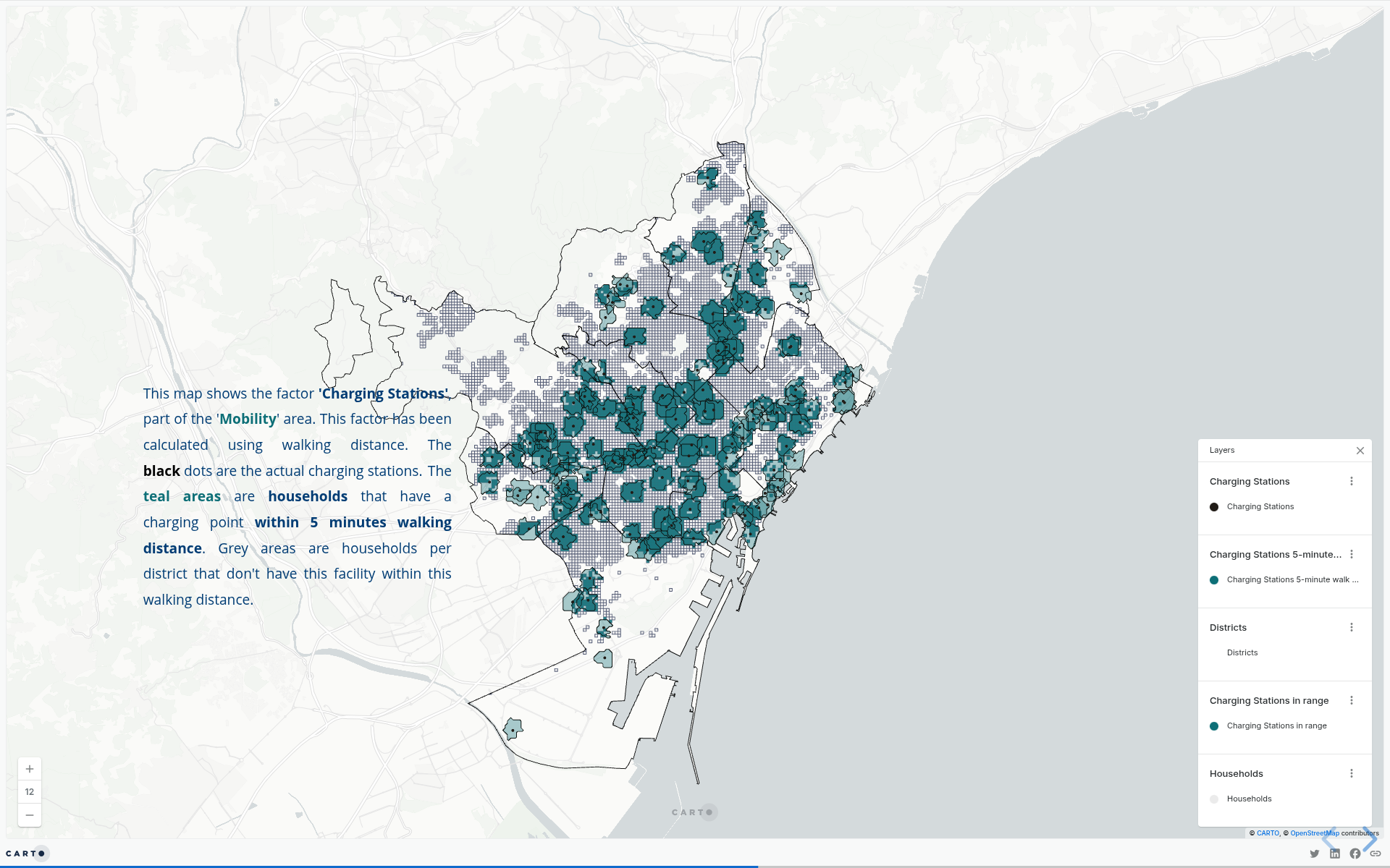 This map shows the charging stations in relation to the population by district.